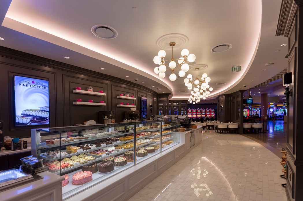 The project included a 65,000-square-foot expansion of the casino floor—an increase of 30%—along with the addition of new dining venues, each offering a unique atmosphere and culinary identity: Crystal Hearts Bar, a high-style lounge positioned at the epicenter of the first-level gaming floor, with ornate custom lighting and large flat-screen TVs, creating a dynamic social hub for guests; MOZEN Asian Kitchen: a richly detailed indoor/outdoor dining space inspired by the Far East, featuring a street-side canopied bar, cocoon glass lanterns, and a blue-and-gold palette layered with wood paneling and floral ceiling treatments; Pink Coffee: a playful, Parisian-inspired café with bright finishes and whimsical charm; Good Times Café: a 24-hour bistro with ivory and taupe leather seating, communal high-top tables, and private alcoves for relaxed dining; and Splash Bar: a vibrant venue with color-changing LED lighting and built-in video poker games, designed for high-energy entertainment.
